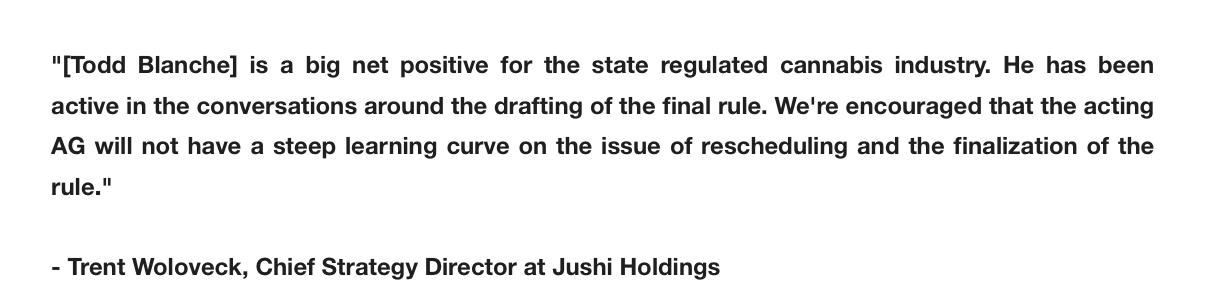 The biggest news for the cannabis sector is that Pam Bondi has been ousted at the DOJ, which of course is preparing the final rescheduling rule. MJBiz had this to say: