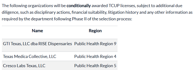 Last week, the Texas Department of Public Safety announced three additional recipients of conditional licenses within the expanded TX medical market program (pain as condition and vapes allowed, w retail restriction removed).