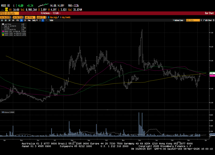 As discussed, MSOS $4 is where the technical rubber begins to hit the road and a series of moving averages. Glass House is the only canna co. trading above that technical toggle but once we get our headline, the space will likely play leapfrog.