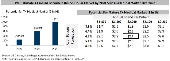 Assuming similar trends of patient growth as FL, we estimate TX could quickly rise from a ~$250M market in 2027, to a $600M market in 2028 & $1B market by 2029 (approaching a similar size as MD, OH, NJ) and $2.4B at maturity.
