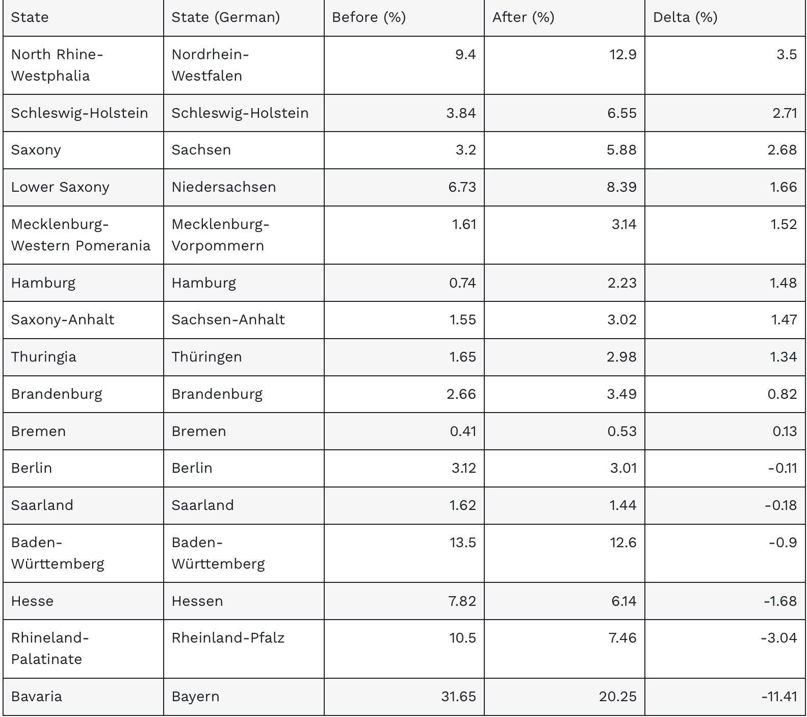 The table below, based on Grünhorn’s data, shows the percentage of patients in each state before and after partial legalization, along with the net change (delta)