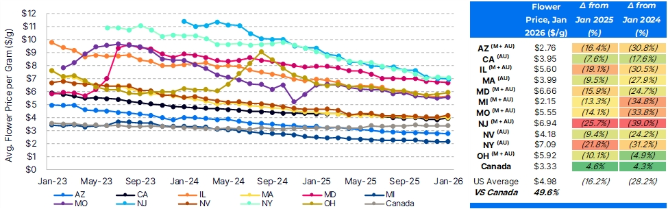 Canadian Prices Holding Steady: Flower prices in Canada were only slightly above Michigan at the start of 2023 and fluctuated modestly before making gradual improvements in 2025, with Jan. 2026 prices tracking to represent 12 consecutive months of growth on a y/y basis.