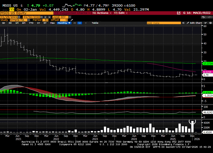 MSOS almost hit $56 in Feb. 2021 after Joe Biden and the Dems swept into office and the specter of federal reform danced across our brains like grateful bears, before they flexed their flaccidity, laid themselves down, and let perfect be the enemy of the good.